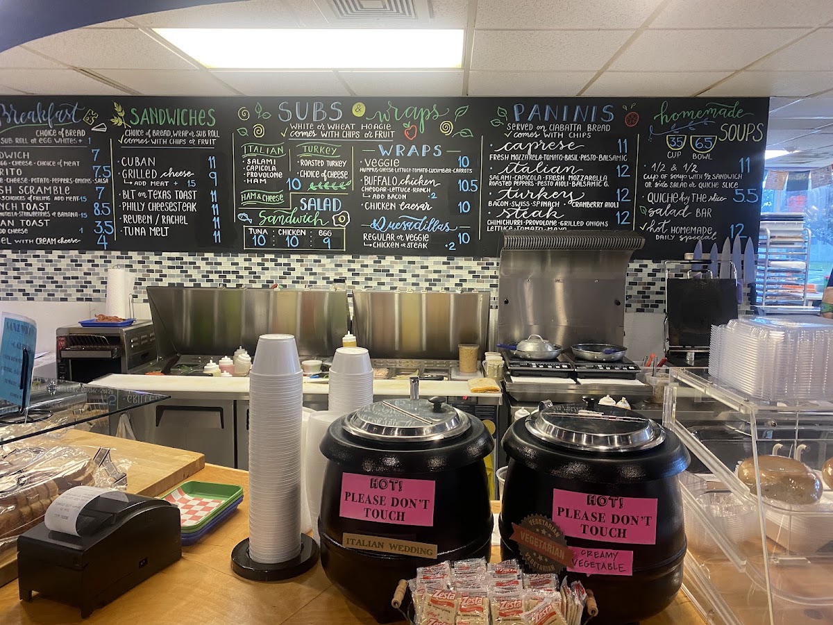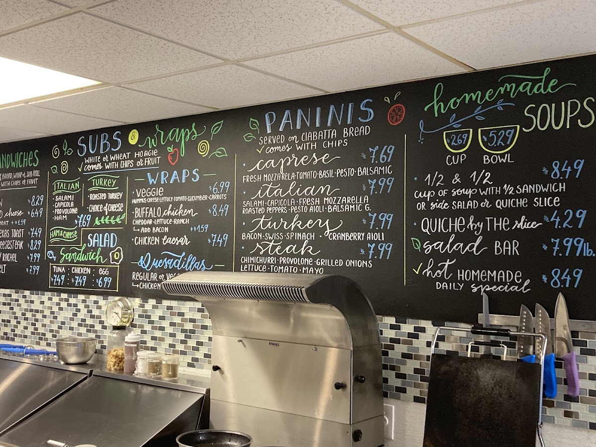 For a lighter bite, you can enjoy a Grilled Cheese Sandwich, a Veggie Wrap, or a Tuna Salad Sandwich. Flatbreads are also available in varieties like Caprese Flatbread and BBQ Chicken Flatbread, while side salads such as Tuna Salad, Chicken Salad, and Curry Chicken Salad offer fresh, healthy options.